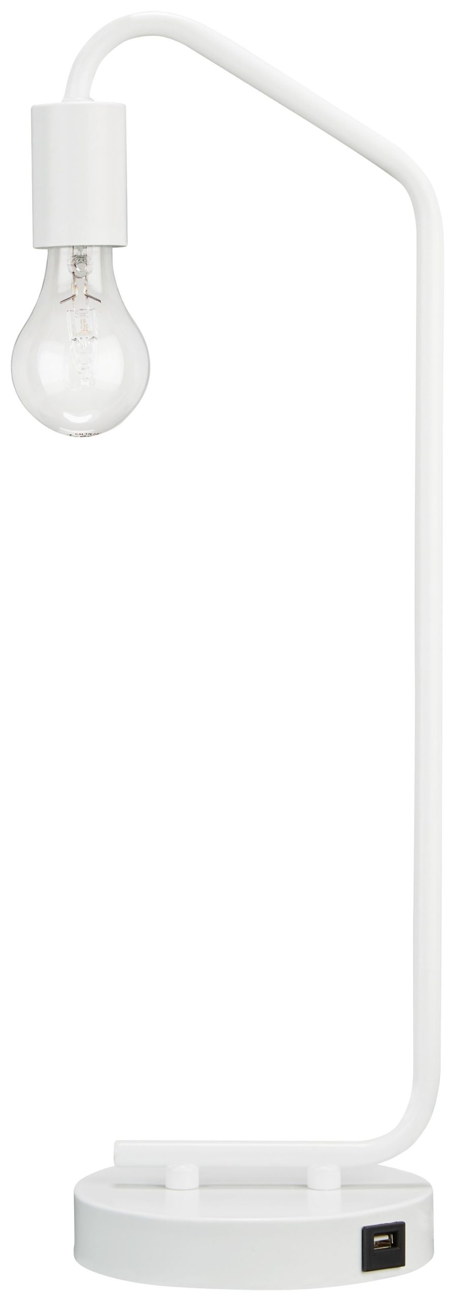 Brilliant in its minimalist form, this desk lamp suspends its exposed bulb in one sleek swoop. Constructed of metal, the compact, lightweight lamp is portable and features a single USB charging port. We see it glowing bedside, on a bookshelf or on either end of a credenza.