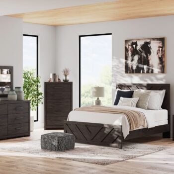 Designed with everyday style in mind, the Prendonea bedroom package is a simply chic approach to modern living. A dark charcoal finish blends black and brown undertones, creating a versatile look that effortlessly pairs with your existing pieces. And for must-have function, this set’s smooth-gliding drawers store clothes and linens in charming fashion.