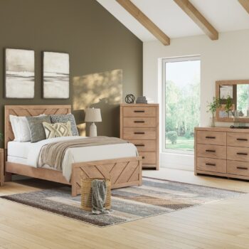 The Sanginlane bedroom package brings a touch of modern farmhouse charm to your home. Its light oak finish and clean lines have a fresh, airy feel, effortlessly creating an inviting atmosphere for a restful night’s sleep.
