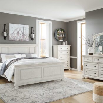 Ashley Furniture Robbinsdale – Antique White – 8 Pc. – Dresser, Mirror, Chest, King Panel Bed, 2 Nightstands