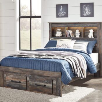 When merged in just the right way, rustic and industrial styles can make one happy marriage. Case in point: this full bookcase bed. A refined take on barn board beauty, its complex, replicated wood grain showcases hints of burnt orange and teal tones for a sense of weatherworn authenticity. Three open cubbies lined with a dimming LED light strip keep bedtime reads top of mind.
