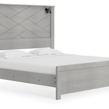 Cool, clean and casually modern. This queen panel bed’s wispy dove gray finish sets the tone for your calming sanctuary. Matte black sconce lights and an abstract design on the headboard bring a fresh look to the bed’s simply stunning profile.
