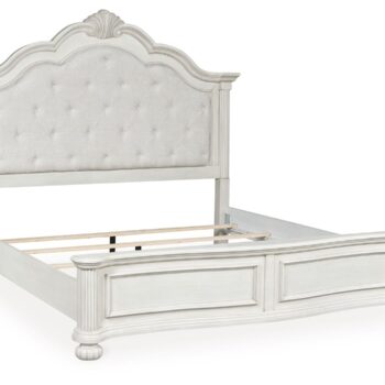 Transform your inner sanctum into a haven of timeless elegance. This traditionally inspired queen upholstered panel bed features a cushioned headboard embellished with a serpentine-shaped crown and light pearl gray upholstery. A contoured footboard with picture frame moulding completes the ageless aesthetic. And did we mention the classic antiqued white finish and stylish reeded bun feet? Talk about relaxed refinement.