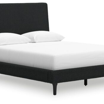 - Includes upholstered panel headboard, panel rails and panel footboard with slats