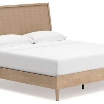 Clean-lined and contemporary but far from stark this twin panel bed is a fresh style awakening. Pairing a light finish with replicated oak grain and textured beige details that replicate the look of cane, its mixed materials bring a naturally versatile vibe to your bedroom. Talk about style with added dimension. The bed’s simplicity plays perfectly with the modern aesthetic and is the stuff dreams are made of.