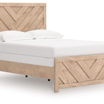 This twin panel bed brings a touch of modern farmhouse charm to your home. Its light oak finish and clean lines have a fresh, airy feel, effortlessly creating an inviting atmosphere for a restful night’s sleep. A striking chevron pattern adds texture and visual interest for a fresh take on country living.