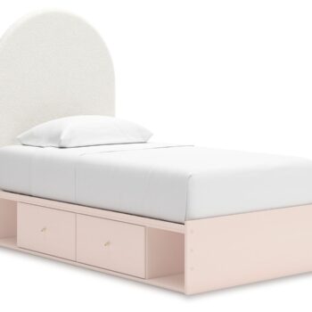 Pretty in pink. This twin upholstered panel bed with storage keeps the spirit of your home’s modern aesthetic while suiting all your young one’s needs. Its cozy-cute upholstery and subtle blush finish bring a playful, charming vibe to bedtime. Made for her and styled for you, it’s a lovely addition to a beautifully chic child’s bedroom.