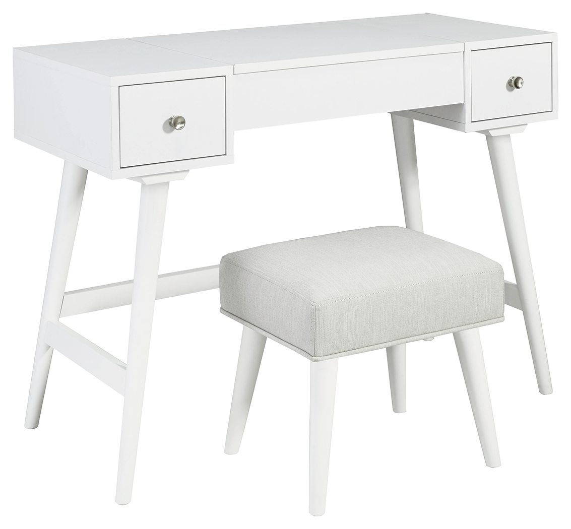 Whether in a teen’s room, master bedroom or dressing area, the mid-century inspired design of this vanity set in white is packed with possibilities. The flip-top design makes it doubly handy as a vanity or writing table; flip it up for access to hidden storage and a mirror, and flip down for a flat work surface. Two smooth-gliding drawers offer additional storage for makeup and beauty essentials, while the sumptuously upholstered seat makes the experience complete.