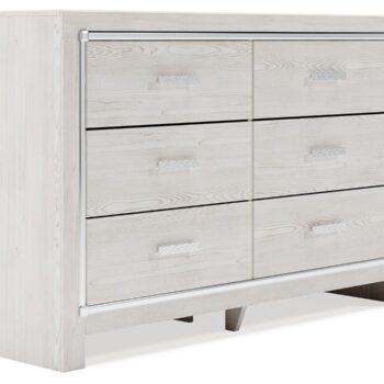 With its clean-lined look and modern attitude, this dresser and mirror is a fresh style awakening. Warm gray hue over replicated oak grain easily complements other furniture finishes. Smooth drawer fronts with antiqued pewter-tone handles completes the aesthetic.