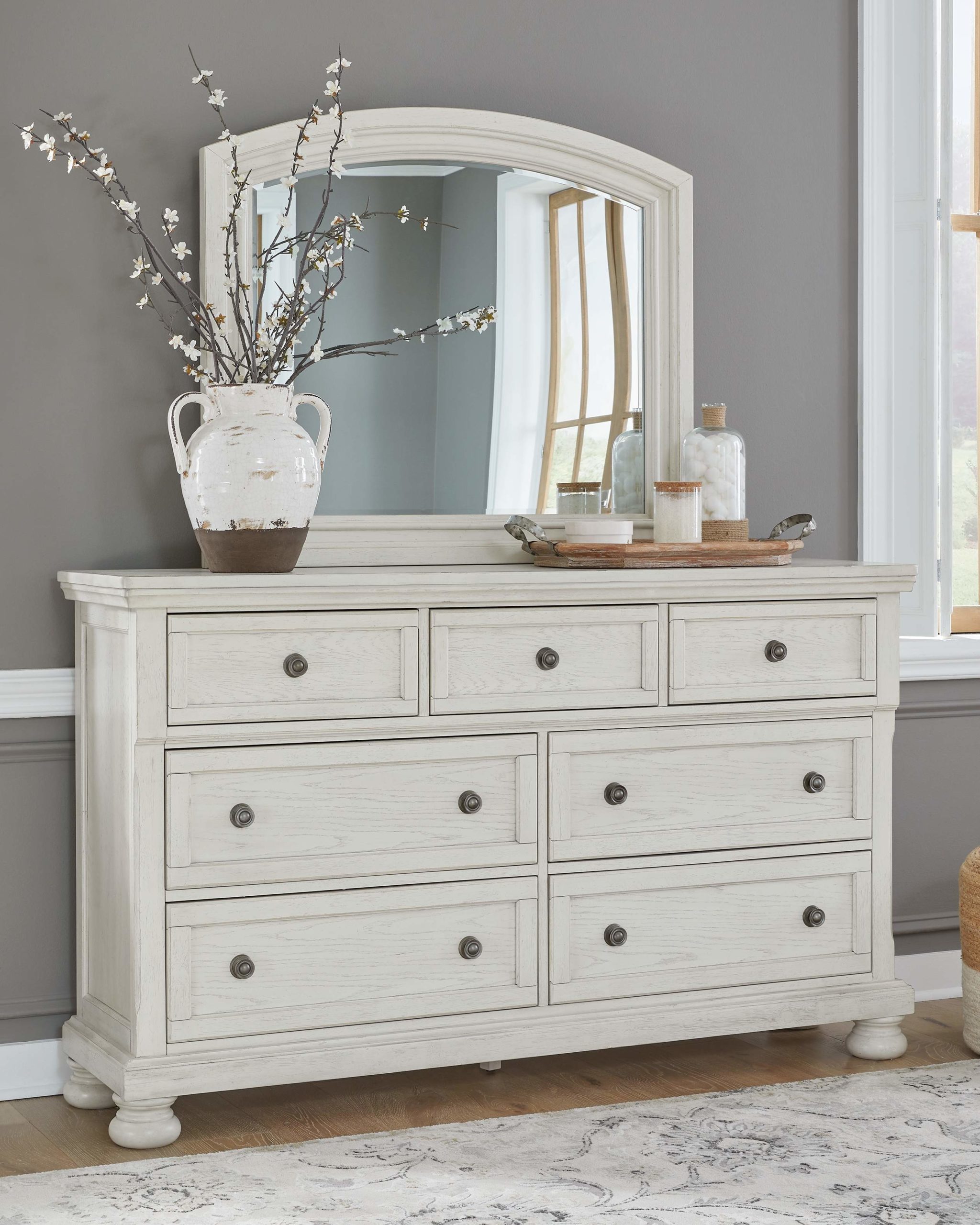 Elegant, timeless furnishings take your bedroom to the next level. Nothing does that better than this dresser with mirror. The antiqued white finish with a wonderful grain texture radiates sophistication, while the dark bronze-tone hardware adds an ornate touch. A hidden pull-out tray behind the top middle drawer puts your small valuables out of sight. Felt-finished top drawers round out the piece for the ultimate tasteful bedroom.