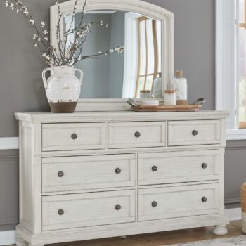 With its clean-lined look and modern attitude, this dresser with mirror is a fresh style awakening. Crisp, white hue over subtle replicated wood grain easily complements other furniture finishes. Smooth drawer fronts with antiqued pewter-tone handles completes the aesthetic.