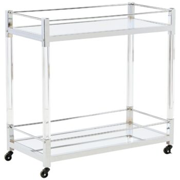 Impress your party guests in style with this bar cart. It features a sturdy design, with black metal rails and an antiqued brown wood finish on the three shelves for a relaxed feel. Smooth-gliding casters offer easy mobility.