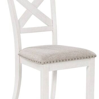 The Robbinsdale dining bench is sure to impress come mealtime. With its antiqued white finish and light gray upholstery with nailhead trim, modern farmhouse-style dining has never been so fashionable. All that’s missing is you and your family.
