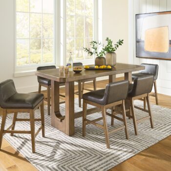 Define your dining space with reliable function and style. This counter height dining package sits comfortably at the intersection of modern lodge and casual lifestyle aesthetics. Its softly rounded corners keep kids safe and your dining area stylish. Charming architectural elements and a light brown glazed finish reflect your warm and welcoming disposition. Even with its poise, this table remains practical.