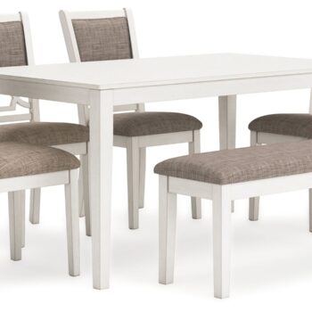 Come together for a delightful dining experience. Chic and relaxed, this dining table and chair set effortlessly captivates with its elegant simplicity. The timeless design pairs a crisp white hue with gray textured upholstery. It’s a fresh addition everyone will notice.