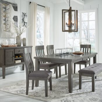 Casual lifestyle design. Made with hardwood solids, select Acacia veneer and engineered wood substrate. Finished with a trend-right antique gray color. D589-35 table features a thick sturdy top with self-storing butterfly leaf. D589-42 gathering table has a storage base and removable leaf for extra seating room. Solid wood chair frames with a contoured comb back design and cushioned foam seat upholstered in a gray textural polyester fabric. Matching bench for versatile seating options.