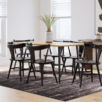 You love a clean and contemporary look so long as it’s warm and inviting. With that in mind, this dining table set serves your sense of style beautifully. “Rough sawn” style finish with a hint of weathered charm tantalizes with a mood of relaxed elegance. Sumptuously upholstered seats in a neutral, textural fabric make the experience complete.