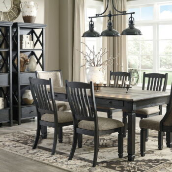 Unique two-tone finish with a combination of Oak and Acacia substrates combining a trendy textured antique black color with table and server tops finished in a textural weathered oak finish. Rectangular dining table features six convenient drawers for storing smaller items. The -02 upholstered host chair inspired by the trendy deconstructed styles for casual living. The -01 side chairs feature a boxed cushioned seat. All chairs feature a heavy woven grayish brown fabric for added textural qualities. The large capacity server has three doors with lattice design. The tall bunching unit has two drawers, three shelves and open lattice sides.