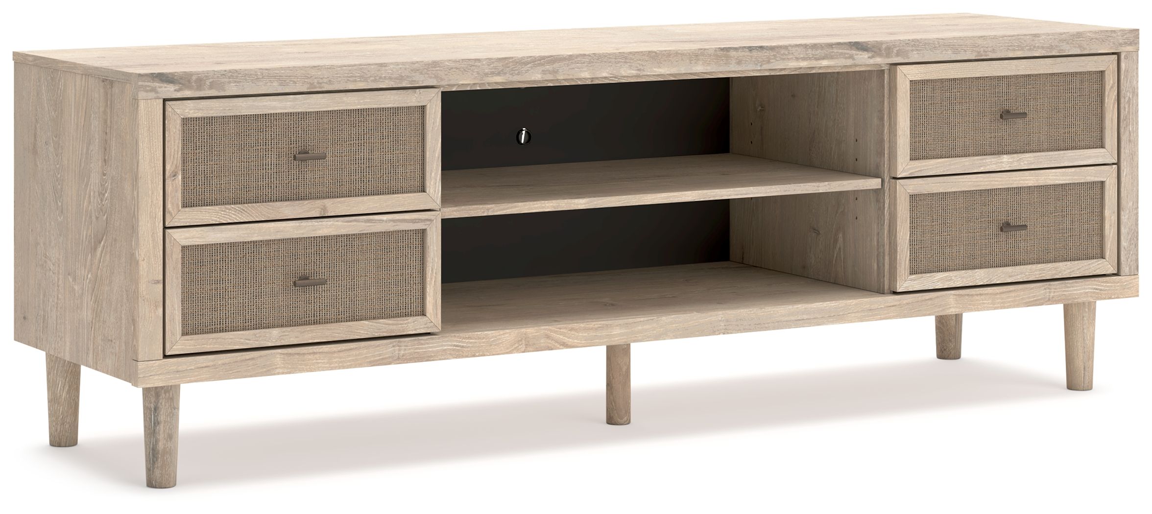 Clean-lined and contemporary but far from stark this TV stand is a fresh style awakening. Pairing a light finish with replicated oak grain and textured beige cane details, its mixed materials bring a naturally versatile vibe to your favorite spot for binge-watching or gaming. Sleek, simple hardware plays perfectly with the modern aesthetic. And prepare to have your mind blown by the vast universe of storage possibilities within the spacious drawers and open shelving.