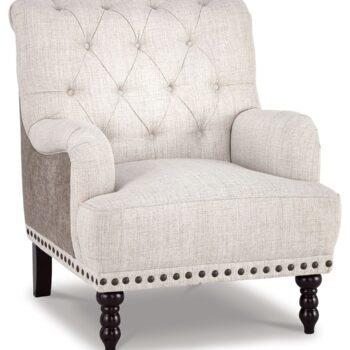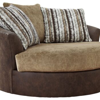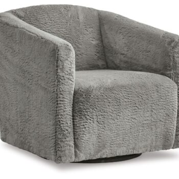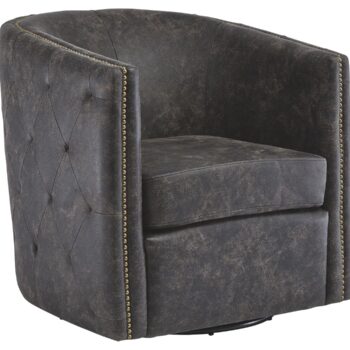 Complete your cozy reading nook or chic seating area with this swivel accent chair. Handsome with its dark faux leather upholstery, the seating is perched on a 360-degree swivel base for the perfect blend of style and function. Design details like tufted sides and antiqued brass nailheads complete the look with added flair.