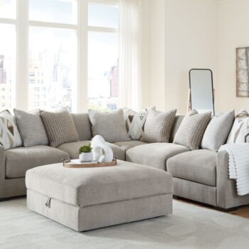 What a pleasant surprise: high-end luxury made comfortably affordable. That’s what makes this sectional with chaise gorup in stone gray so alluring. Made exclusively for those wanting to make a designer statement, this finely crafted sectional and ottoman are dressed to impress with crisp, clean styling, sumptuous cushioning and fabulous fabric for a richly neutral aesthetic.