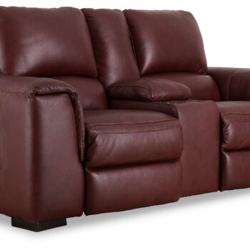 Master statement-making contemporary comfort with this power reclining loveseat. It displays a striking yet streamlined profile, with expertly matched leather and faux leather upholstery in an auburn hue balancing natural beauty and refined design. Adjustable headrests and USB charging polish off this richly crafted piece.