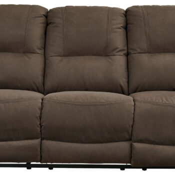 Kick back, relax, and enjoy some sports on TV with this reclining loveseat. You will love its double stuffed pillow top arms and soft-as-suede faux leather upholstery. The family-friendly dark gray color and creative stitching add panache. Recline in comfort even if floor space is limited, thanks to the space-efficient zero wall design. This bustle back loveseat with console and cup holders will always be a win.