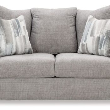 What’s new in neutrals? Shades of gray, of course. Embrace the sophisticated design trend with this gorgeous loveseat, which offers a clean-lined, contemporary style at a comfortably cool price. Sure to lift your spirits, the plush chenille fabric is fabulously neutral. Modern flared arms give it a distinctive flair. This loveseat also arrives with two cool brushstroke accent pillows to elevate the taste and comfort level.