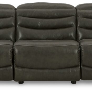 For those seeking to curate a living room retreat that offers superior comfort and a contemporary aesthetic, this sleekly designed power reclining loveseat with console will become your favorite source of at-home serenity. Rest on leather match upholstery, and use the one-touch power control to recline and adjust the headrests with ease. As you recharge after a long day, your devices can too with USB charging. This loveseat is visually enticing in a luxe dark gray, with slope track arms and stitched detailing on the back to enhance its modern appeal.