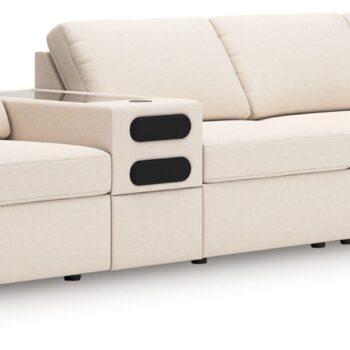 - Includes 5 modular pieces: left-arm facing corner chair, console with audio system, console with storage, armless chair and right-arm facing corner chair