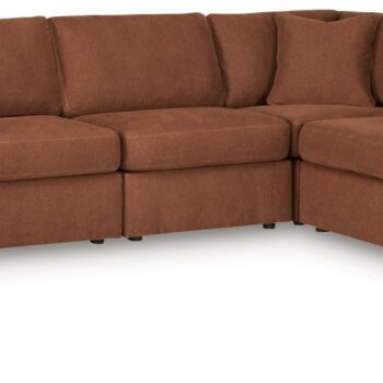 - Includes 4 modular pieces: left-arm facing corner chair, armless chair, console with storage and right-arm facing corner chaise