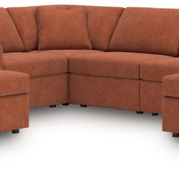 • Includes 5 modular pieces: left-arm facing corner chaise, console with audio system, right-arm facing corner chaise and 2 armless chairs