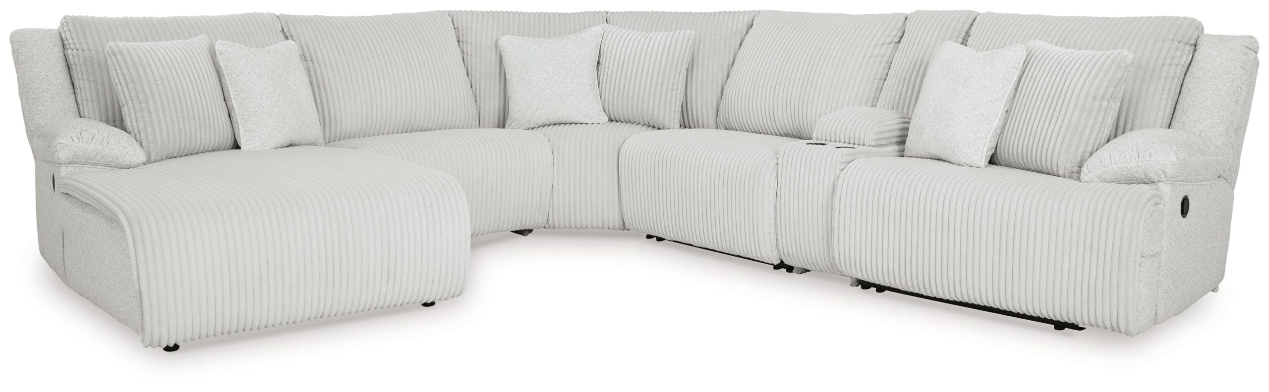 - Includes 6 pieces: left-arm facing press back chaise, armless recliner, armless chair, console with storage, wedge and right-arm facing recliner