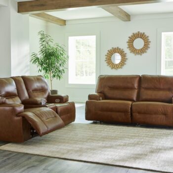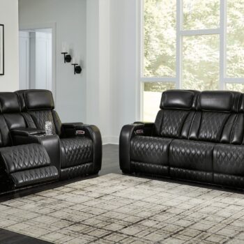 Reserved for him and made for her, this power reclining set delivers all the comfort and style you could ask for. Inspired by sports car interiors, the seating area is covered in real leather for your pleasure, with a “perforated automotive” treatment for that much more appeal. Positioned at your fingertips, the advanced one-touch power control puts you in the driver’s seat with everything from an Easy View™ power headrest and power lumbar support, to a USB port and wireless charging for your phone.
