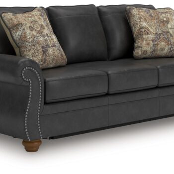 Everyone can have the best rest in the house with this queen sofa sleeper. Its nailhead trim puts the finishing touches on the traditional roll arms you love. The sofa’s comfy, durable cushions wrapped in a rustic yet sophisticated faux leather keep you feeling relaxed, while its turned legs show that style and quality flow from top to bottom. A pull-out queen mattress made with quality memory foam comfortably accommodates overnight guests.