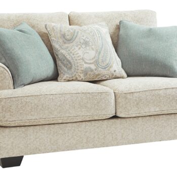 This sofa strikes a beautiful balance between classic and current. Its traditional elements include t-cushion seating and setback roll arms, angled for modern flair. Posh pillows in spa mist and jacquard paisley make a muted, mellow complement to the sofa’s casual textured chenille upholstery. And the choice of sandstone beige is a light and lovely style awakening.