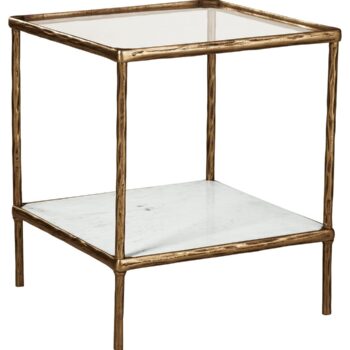 Classic in design with a dash of textural appeal, this accent table provides both flair and function. The glass tabletop offers the perfect perch for a lamp, while the white marble lower shelf is ideal for resting trendy coffee table books and other decorative pieces. An antiqued black finish on the frame has an edgy look that remains versatile, suiting spaces from casual to contemporary.