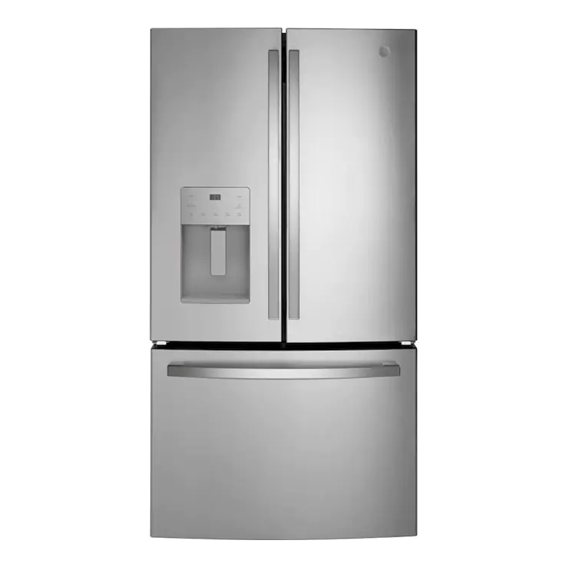 Keep healthy snacks and fresh ingredients accessible with this spacious GE refrigerator, which features ample shelf space and full-width door bins to accommodate all your groceries. LED lights help you find what you need.