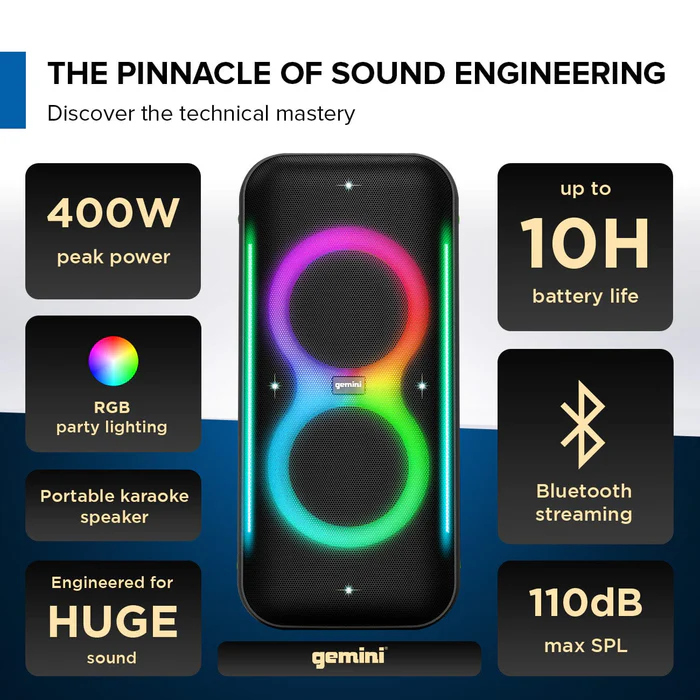 Gemini Sound Duo, 400W Bluetooth Party Speaker with LED Lights & Wireless Mic