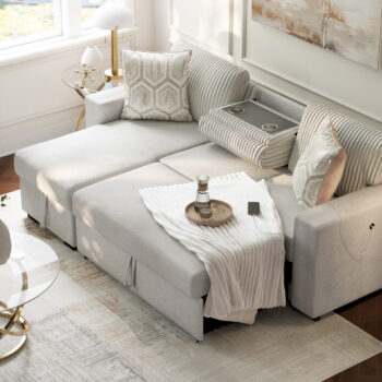 A comfy chair that turns into a cozy bed! Super easy and saves space. Available in full or queen size. Covers: corduroy or faux fur. Colors: gray or ivory.