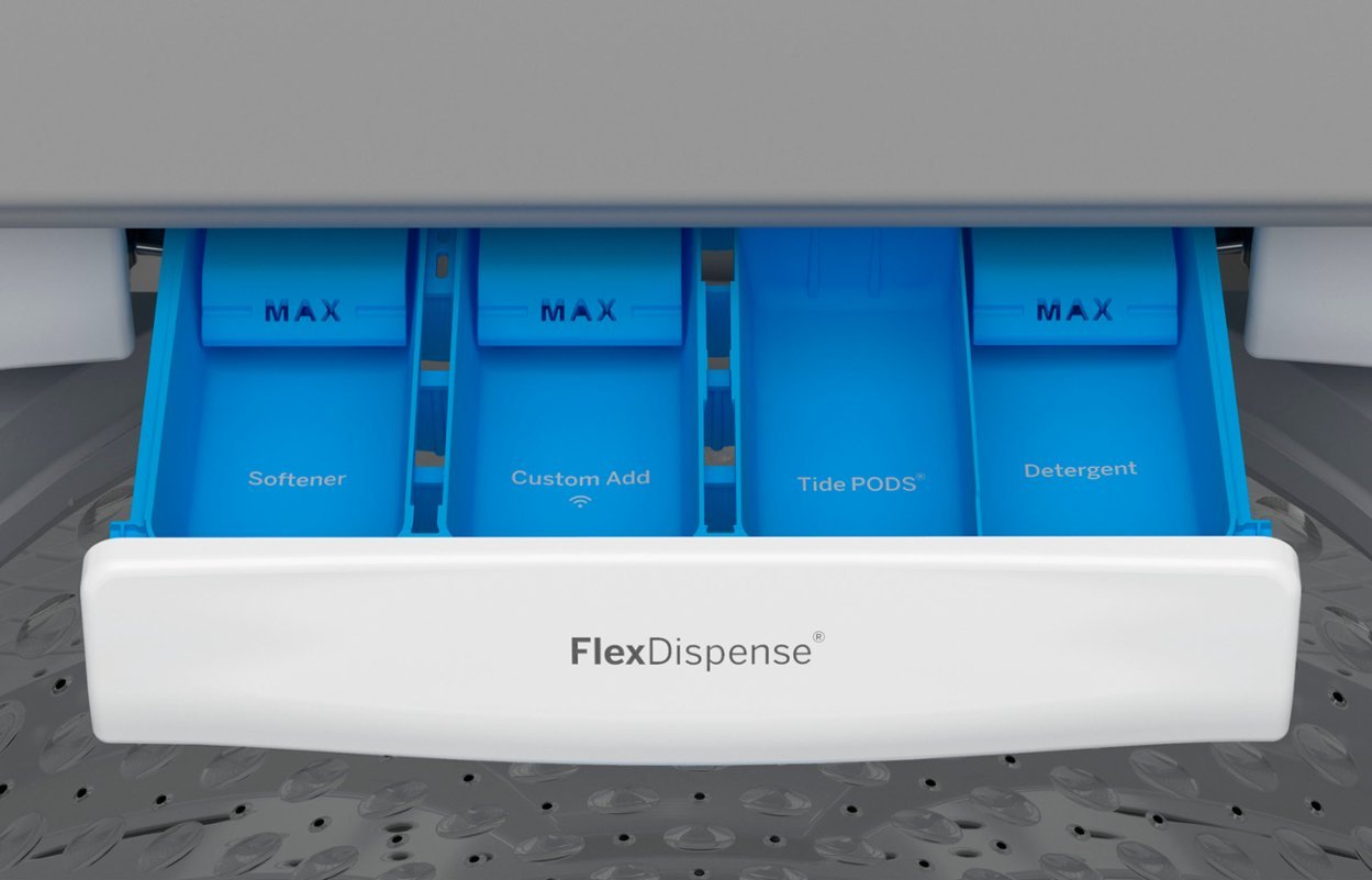 Dedicated dispensers for detergent, detergent pods, fabric softener, and other common additives delivering faster activation and optimal cleaning performance